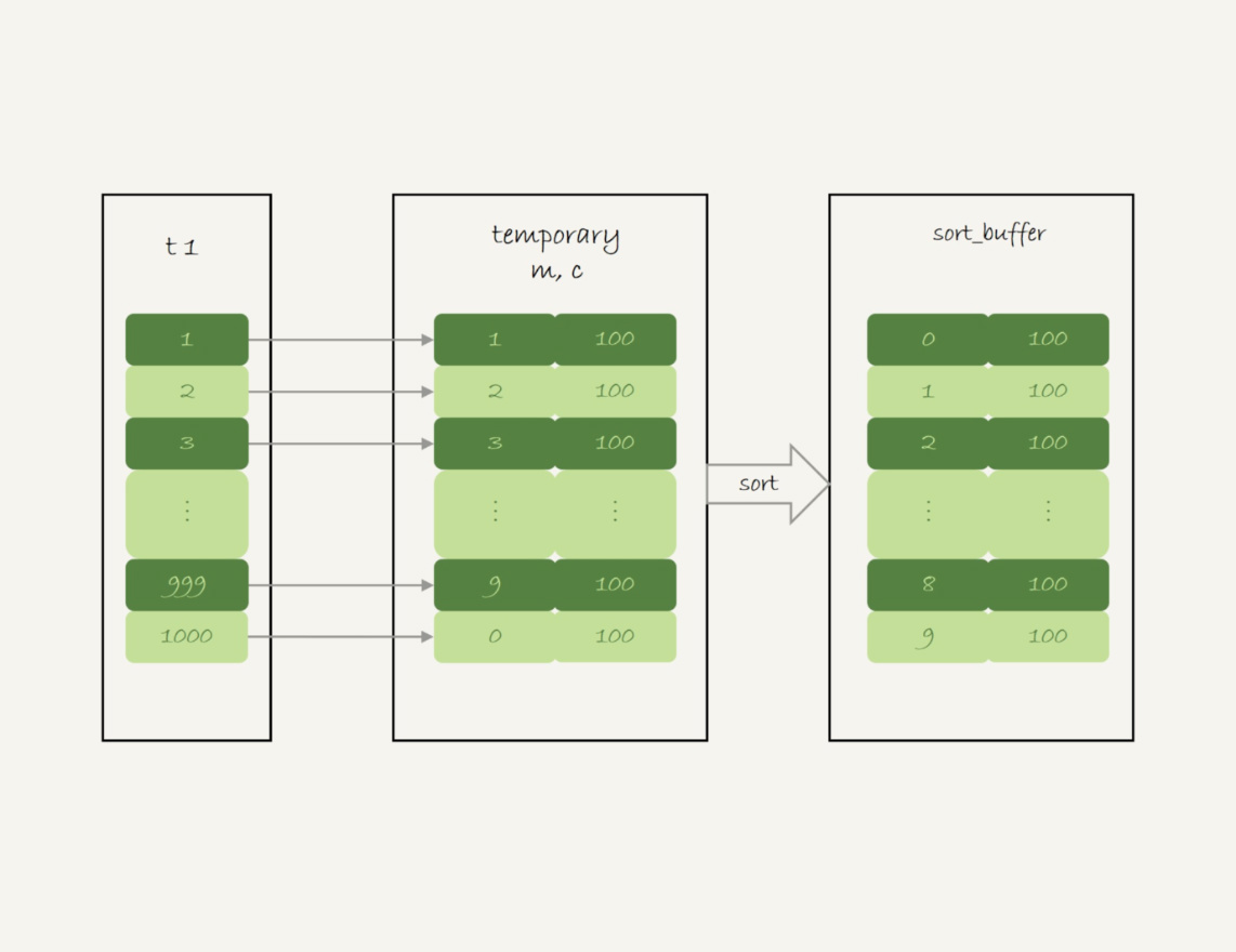 -- 跳过最后的排序阶段,直接从临时表中取回数据 mysql> EXPLAIN SELECT id%10 AS m, COUNT(*) AS c FROM t1 GROUP BY m ORDER BY NULL; +----+-------------+-------+-------+---------------+------+---------+------+------+------------------------------+ | id | select_type | table | type | possible_keys | key | key_len | ref | rows | Extra | +----+-------------+-------+-------+---------------+------+---------+------+------+------------------------------+ | 1 | SIMPLE | t1 | index | PRIMARY,a | a | 5 | NULL | 1000 | Using index; Using temporary | +----+-------------+-------+-------+---------------+------+---------+------+------+------------------------------+ -- t1中的数据是从1开始的 mysql> SELECT id%10 AS m, COUNT(*) AS c FROM t1 GROUP BY m ORDER BY NULL; +------+-----+ | m | c | +------+-----+ | 1 | 100 | | 2 | 100 | | 3 | 100 | | 4 | 100 | | 5 | 100 | | 6 | 100 | | 7 | 100 | | 8 | 100 | | 9 | 100 | | 0 | 100 | +------+-----+