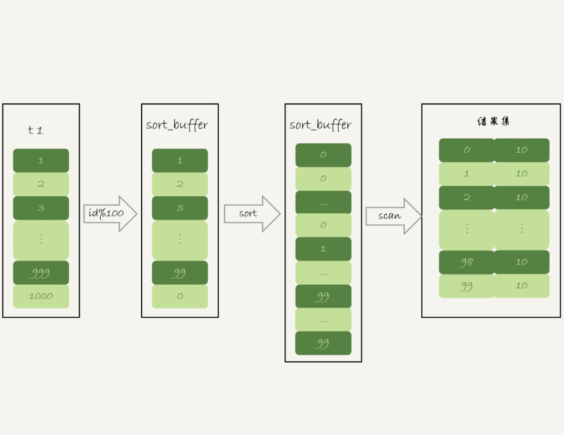 扫描t1的索引a,依次取出里面的id值,将id%100的值放入sort_buffer
