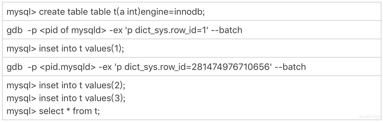 验证该结论:通过gdb修改系统的自增row_id。用gdb是为了便于复现问题,只能在测试环境使用。