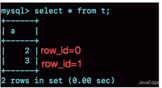 之后再插入a=3,由于row_id=1,就覆盖了之前a=1的行,因为a=1这一行的row_id也是1。