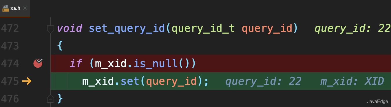 若当前语句是该事务执行的第一条语句,则MySQL还会同时把query_id赋值给该事务的Xid: