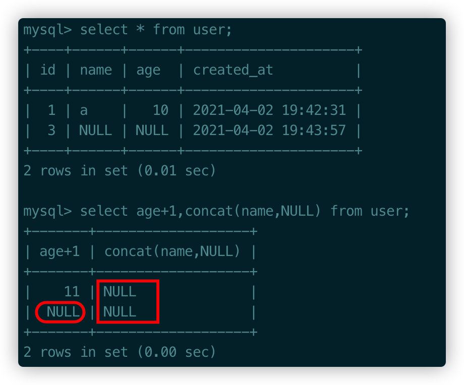 user表第二条记录age是NULL,所以+1之后还是NULL,name是NULL,进行concat运算之后结果还是NULL。