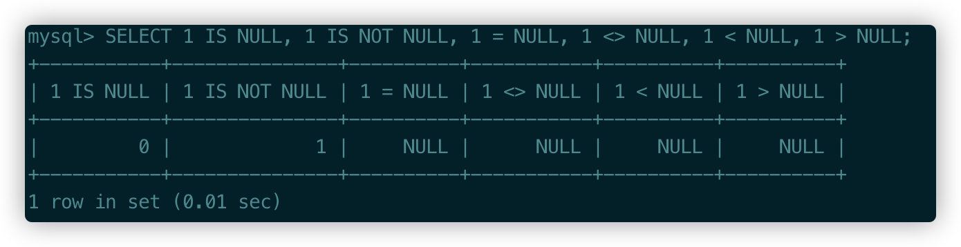 NULL和其他任何值进行运算都是NULL,包括表达式的值也是NULL。