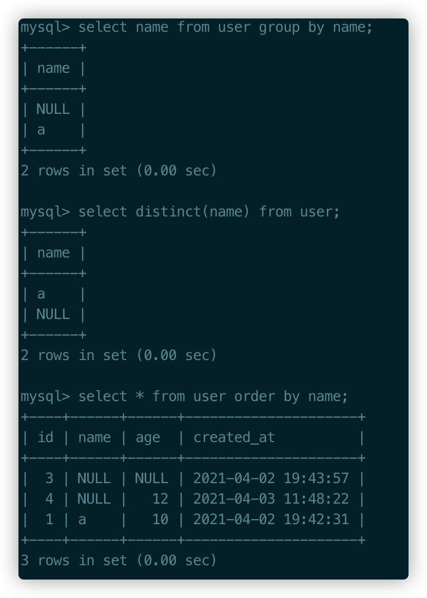 对于distinct和group by来说,所有的NULL值都会被视为相等,对于order by来说升序NULL会排在最前
