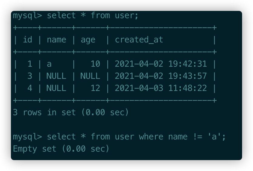 表中只有一条有名字的记录,此时查询名字!=a预期的结果应该是想查出来剩余的两条记录,会发现与预期结果不匹配。