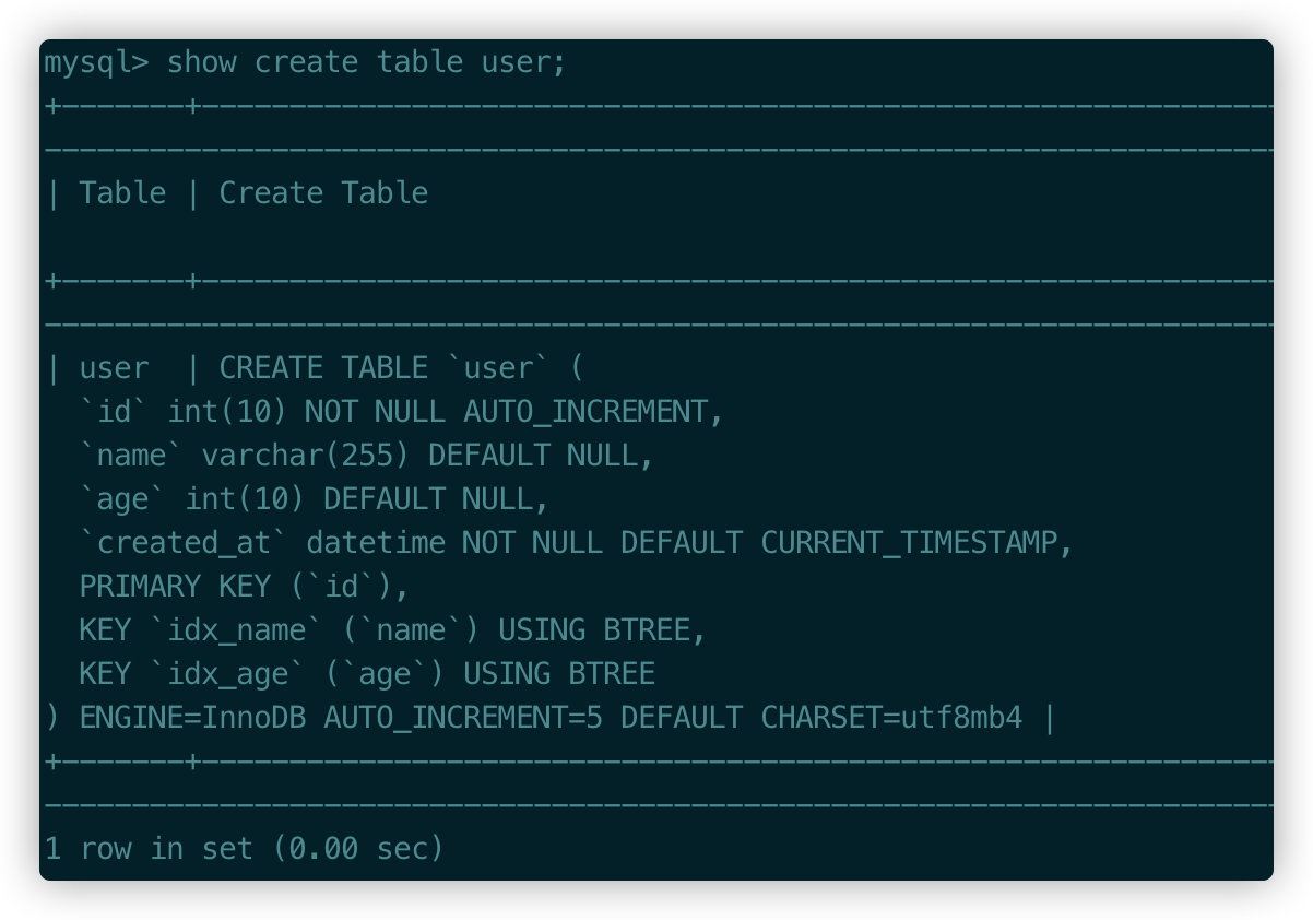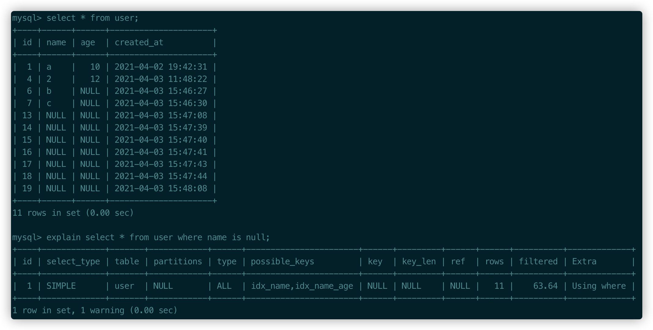 为了验证NULL字段对索引的影响,分别对name 和age添加索引。