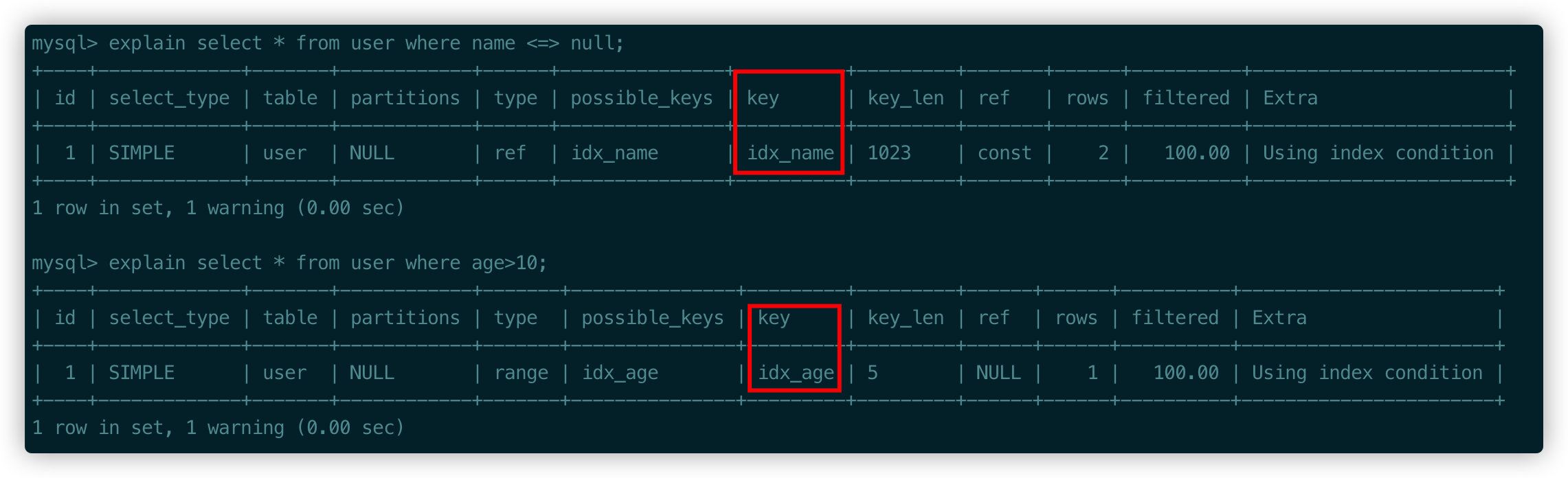 关于网上很多说如果NULL那么不能使用索引的说法,这个描述其实并不准确,根据引用官方文档[3]里描述,使用is NULL和范围查询都是可以和正常一样使用索引的,实际验证的结果好像也是这样,看以下例子。