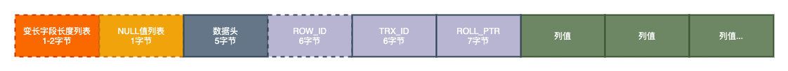 InnoDB的默认行存储格式是COMPACT,存储格式如下所示,虚线部分代表可能不一定会存在。