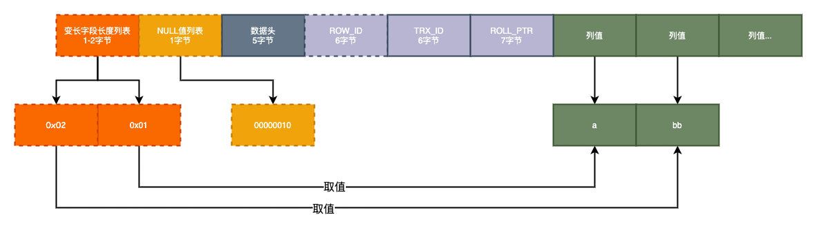 这样就是一个完整的数据行数据的格式,反之,如果我们把所有字段都设置为NOT NULL,并且插入一条数据a,bb,ccc,dddd的话,存储格式应该这样:
