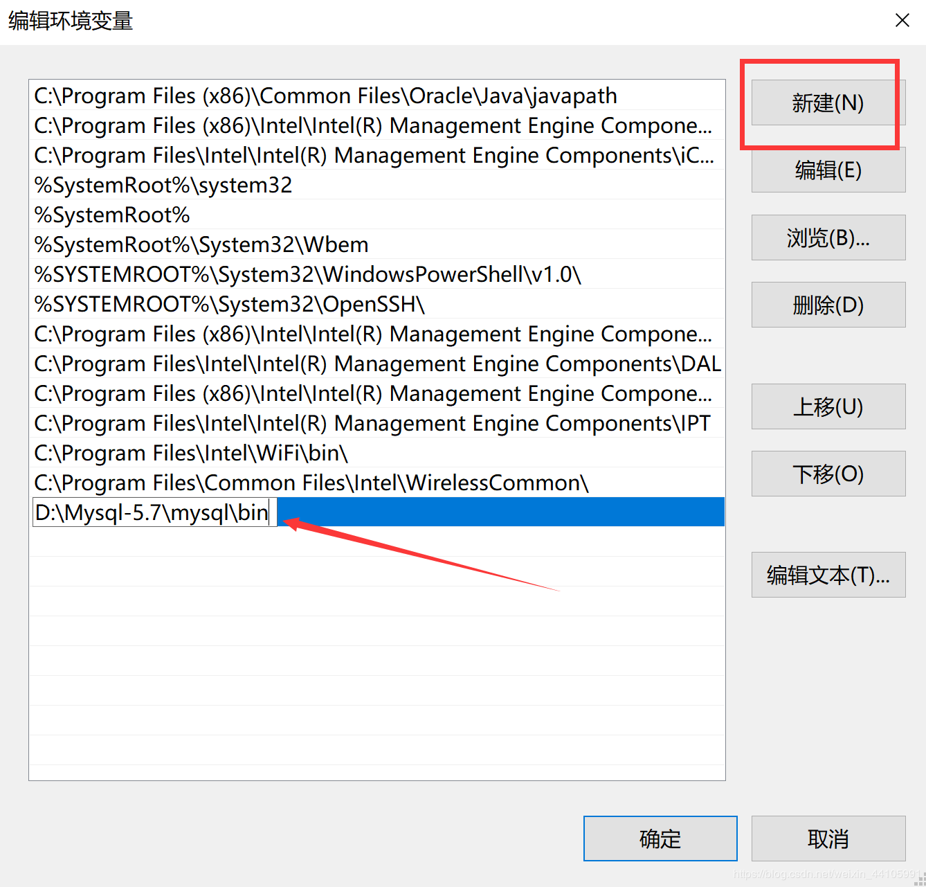 选中系统变量中的 “path”,在 path 值里面输入: D:\Mysql-5.7\mysql\bin 保存退出