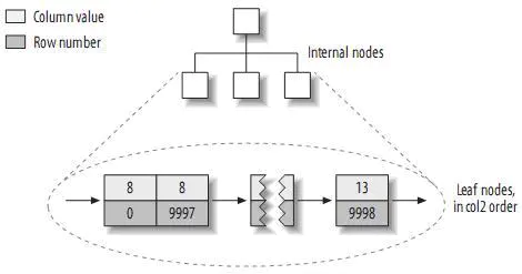 可以看到,和InnoDB中的主键索引不同,二级索引并没有在叶子结点存储所有的行数据信息,而是除了索引列的值外,只存储了这个数据行所对应的主键的信息。我们知道在MyISAM中,二级索引和主键索引一样,除了索引列的值外,只存储了一个指针(行号)的信息。