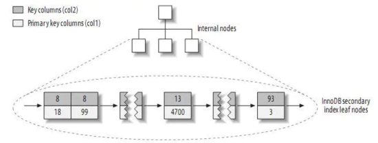 首先,和MyISAM上的主键索引一样,这里的索引的叶子结点上同样也是包括了主键的值,并且主键的值是按照顺序排列的。不同的是,每一个叶子结点还包括了事务id,回滚指针和其他非主键列的值(这里指的col2)。所以我们可以理解为InnoDB上的聚簇索引,是将原来表格中的所有的行数据按照主键进行排列然后放在了索引的叶子节点上。这就是一个与MyISAM在主键索引上的一个不同。 MyISAM的主键索引在查找到对应的主键值之后需要通过指针(行号)再去表中找到相对应的数据行,而InnoDB的主键索引,将数据信息全部放在了索引里面,可以直接在索引中查找拿到。