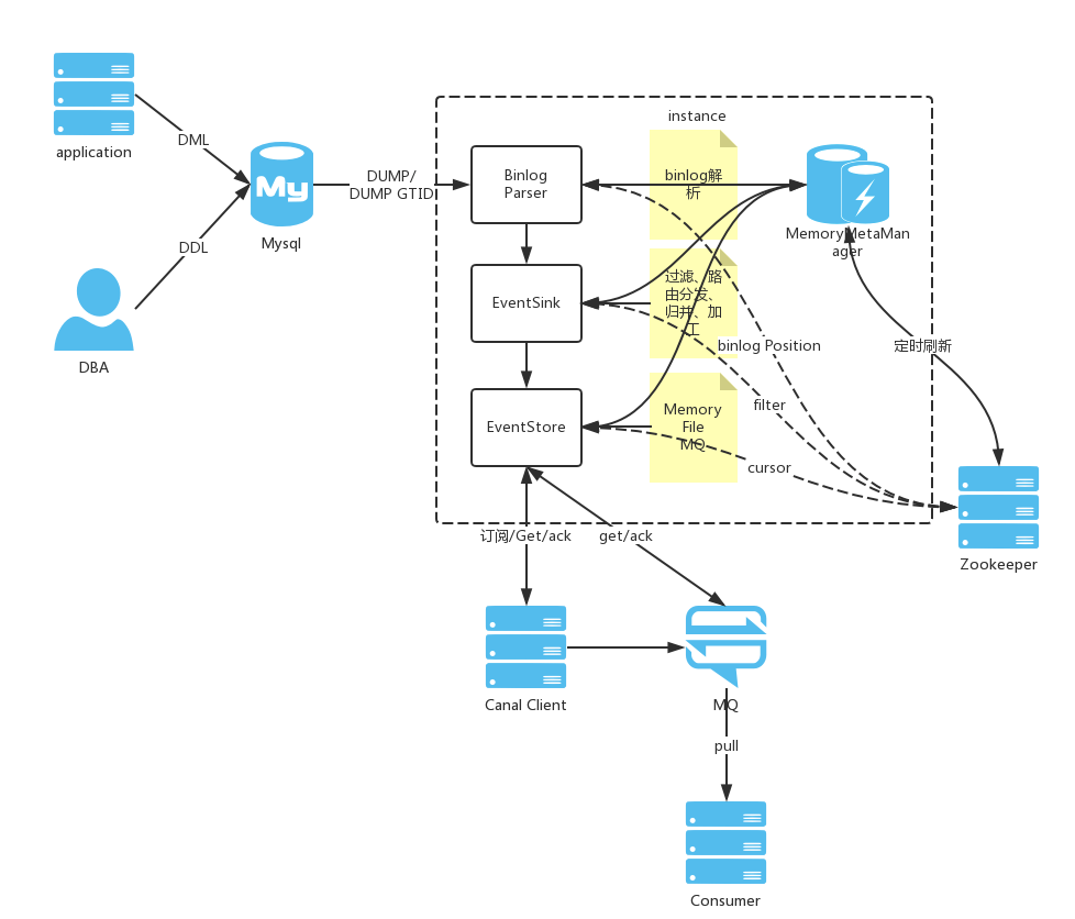 Connection获取上一次解析成功的log position(如果是第一次启动,则获取初始指定的位置或者是当前数据库的binlog log position)Connection建立连接,向MySQL master发送BINLOG_DUMP请求MySQL开始推送binary Log接收到的binary Log通过BinlogParser进行协议解析,补充一些特定信息。如补充字段名字、字段类型、主键信息、unsigned类型处理等将解析后的数据传入到EventSink组件进行数据存储(这是一个阻塞操作,直到存储成功)定时记录binary Log位置,以便重启后继续进行增量订阅