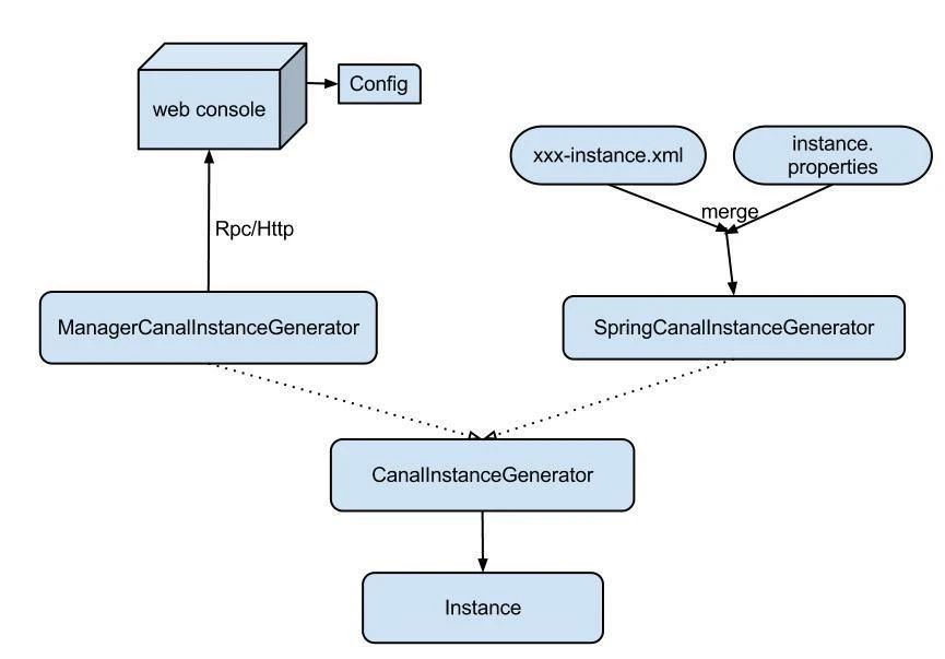 instance代表了一个实际运行的数据队列,包括了EventPaser、EventSink、EventStore等组件。抽象了CanalInstanceGenerator,主要是考虑配置的管理方式:
