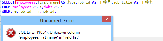 #2.为表起别名 ①提高语句的简洁度 ②区分多个重命名的字段 注意:如果为表起了别名,则查询的字段就不能使用原来的表名去限定 SELECT first_name AS 名,e.job_id AS 工种号,job_title AS 工种名 FROM employees AS e,jobs AS j WHERE e.job_id = j.job_id;