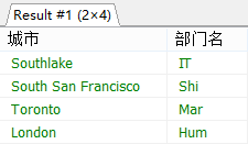 #案例4.查询城市名中第二个字符为o对应的城市名与部门名。 SELECT city AS 城市,department_name AS 部门名 FROM locations AS l,departments AS d WHERE l.location_id = d.location_id AND city LIKE '_o%';