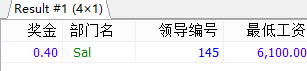 #案例2.查询有奖金的每个部门的部门名和部门的领导编号和该部门的最低工资。 #查询的时候不确定把两个列都加上。 SELECT commission_pct AS 奖金,department_name AS 部门名, d.manager_id AS 领导编号,MIN(salary) AS 最低工资 FROM employees AS e,departments AS d WHERE e.department_id = d.department_id AND commission_pct IS NOT NULL GROUP BY department_name,d.manager_id;