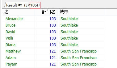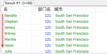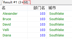 #案例3.查询员工名,部门名与所在的城市,城市以s开头,按姓名降序排列。 SELECT first_name AS 名,d.manager_id AS 部门名,city AS 城市 FROM employees AS e,departments AS d,locations AS l WHERE e.department_id = d.department_id AND d.location_id = l.location_id AND city LIKE 's%' ORDER BY department_name DESC;