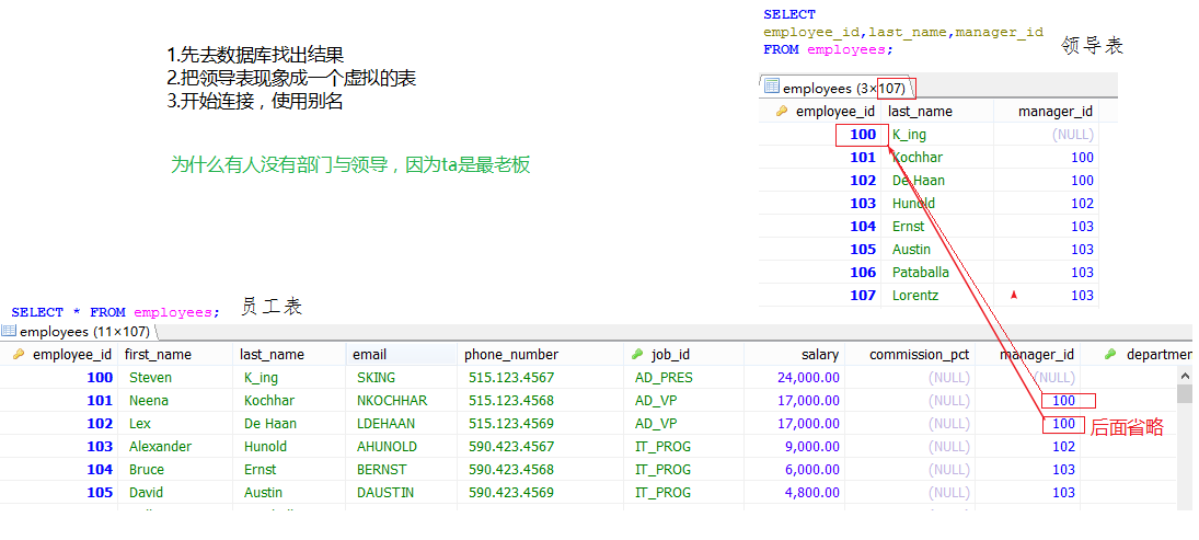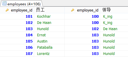#案例1.查询员工名和上级的名称. SELECT e.employee_id,e.last_name AS 员工, m.employee_id,m.last_name AS 领导 FROM employees e,employees m WHERE e.manager_id = m.employee_id;