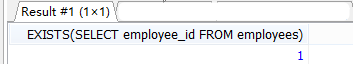 #四.EXISTS后面(相关子查询) 语法:EXISTS(完整的查询语句) 备注:完整的查询语句可以是一行一列,可以使一行多列 注意:先走外查询,然后根据某个字段的值再去过滤 EXISTS 判断(布尔类型)值存不存在,结果只有两种:1有,0没有 #引入 SELECT EXISTS(SELECT employee_id FROM employees);