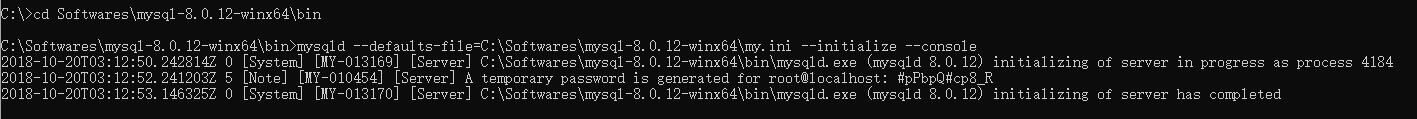 mysqld --defaults-file=C:\Softwares\mysql-8.0.12-winx64\my.ini --initialize --console