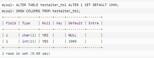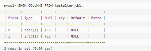 尝试以下 ALTER TABLE 语句, 在执行成功后,使用 SHOW COLUMNS 查看表结构的变化: