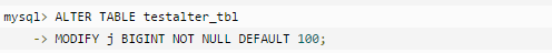 以下实例,指定字段 j 为 NOT NULL 且默认值为100 。