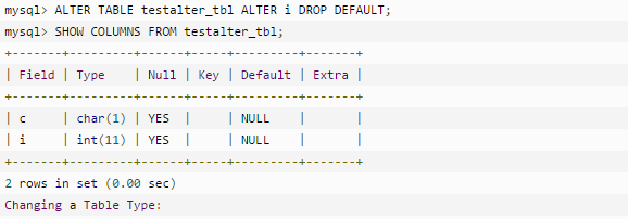 11、也可以使用 ALTER 命令及 DROP子句来删除字段的默认值,如下实例: