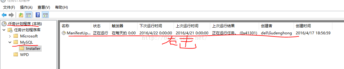 这一条安装命令,Installing MySQL 5.6.21 using MySQLInstallerConsole.exe win10状态下,从开始-->所有应用--->管理工具--->任务计划程序-->左侧任务计划程序库文件夹(或直接用快捷方式win+Q 输入 任务计划程序 点击上面的程序进入),展开文件夹-->mYsql子文件夹installer,点击。在右侧窗口右键点击鼠标,选择“禁用”即可,如下图: