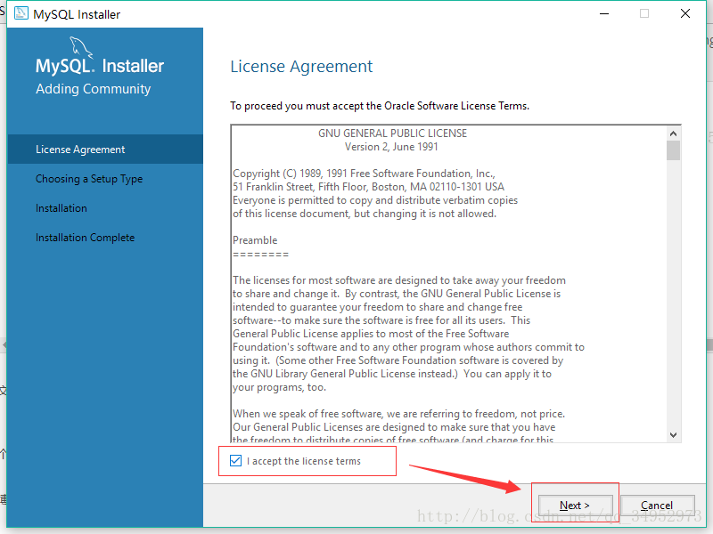 勾选accept the license terms,然后点击next
