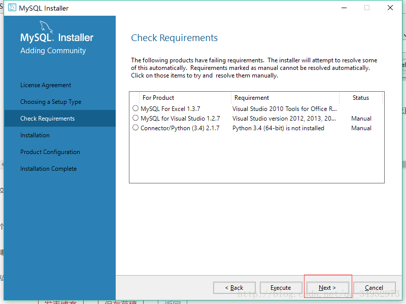 接下来下面选框里面的意思是说装的过程中需要这些依赖但是这些依赖没有装,因为我不玩python,所以我直接点击的next,如果大家有人需要用python之类的话可以点击execute,后续步骤我就没有放出来了。next后会有一个confirm框,点击yes即可