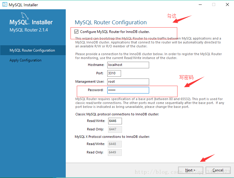 但是我的这里下一步中有一个creating mysql router configuration files失败了我就点击cancel(因为百度出来的答案说是权限问题我不懂怎么改),然后直接来到connect server,直接在下面输入密码然后check后next,会又有一个让我们execute的界面,点击然后就可以finish了(忘记截图了,抱歉)