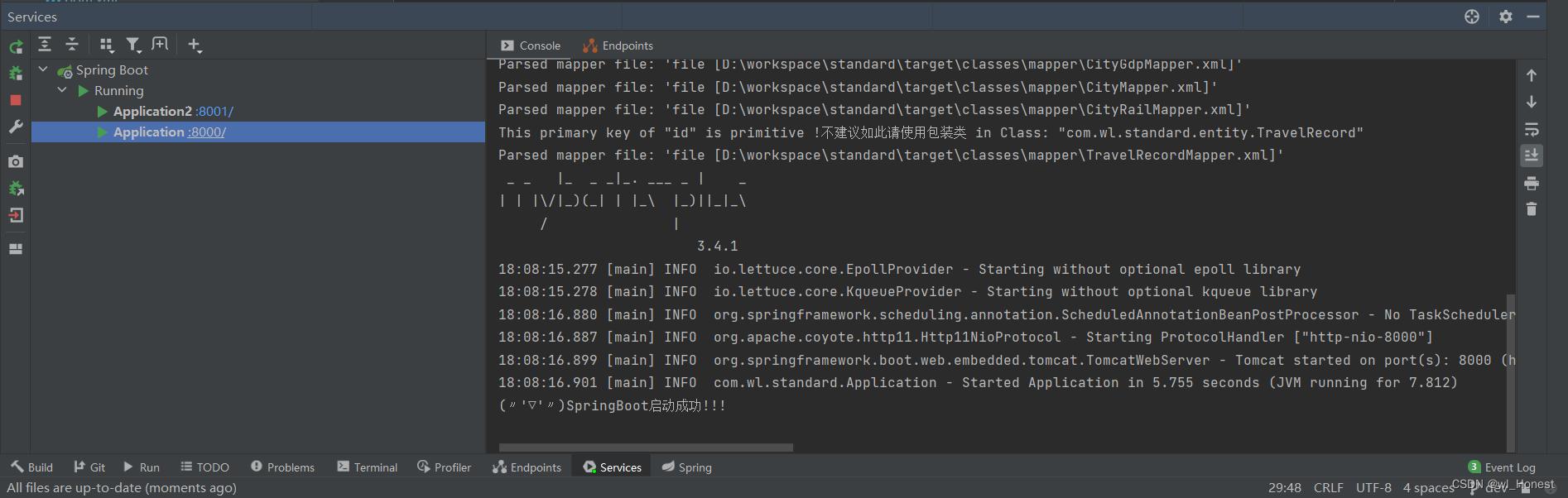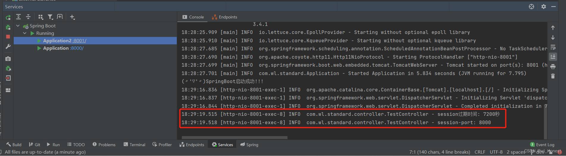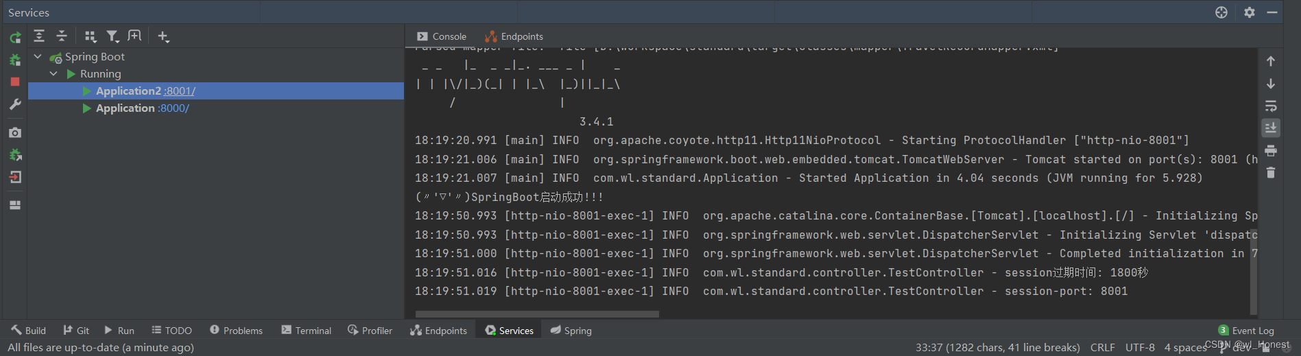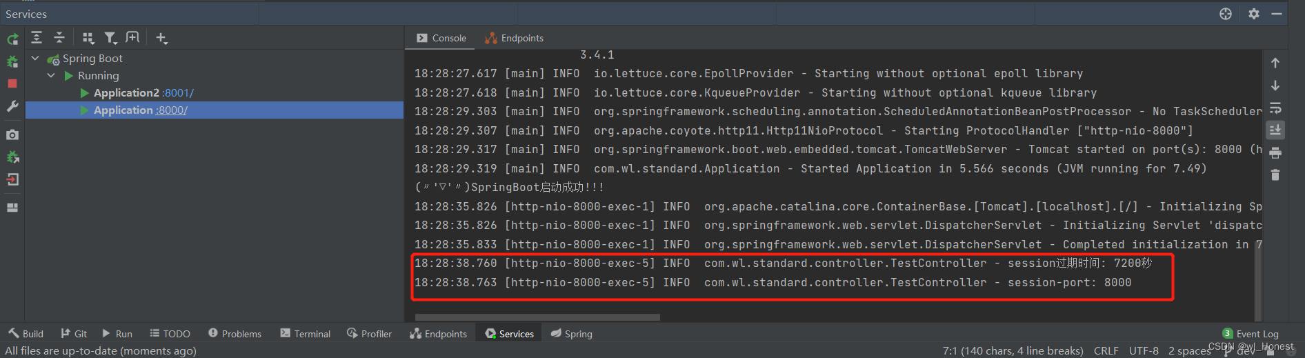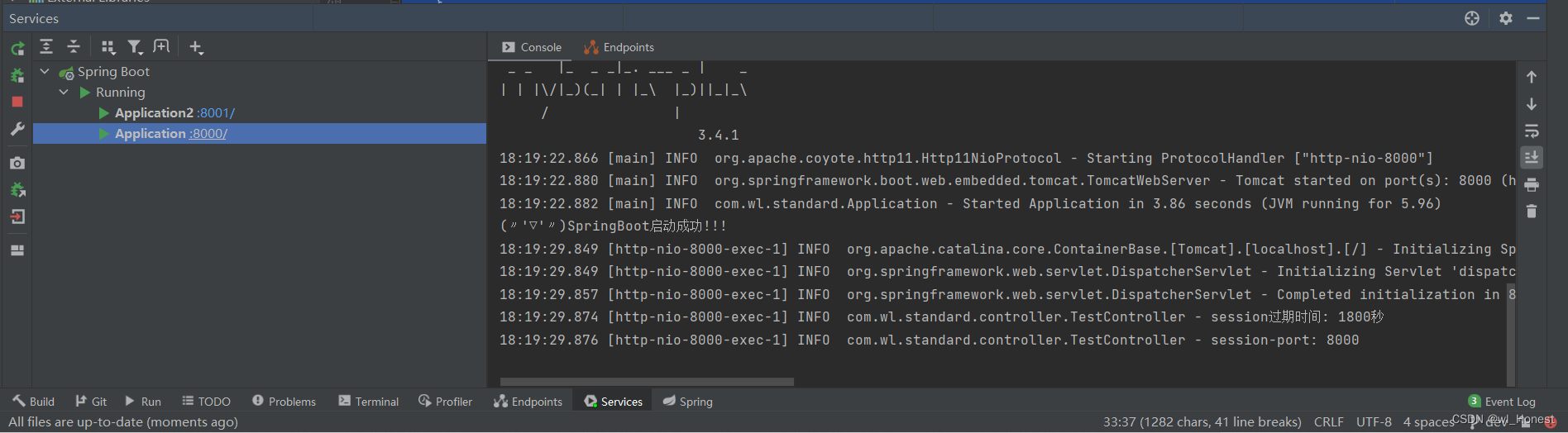 企业项目中,一般都是将项目部署到多台服务器上,用nginx做负载均衡。这样可以减轻单台服务器的压力,不过这样也带来一些问题,例如之前单机部署的话,session存取都是直接了当的,因为请求就只到这一台服务器上,不需要考虑数据共享。接下来分别用8000和8001端口启动同一个项目,做一个简单演示: