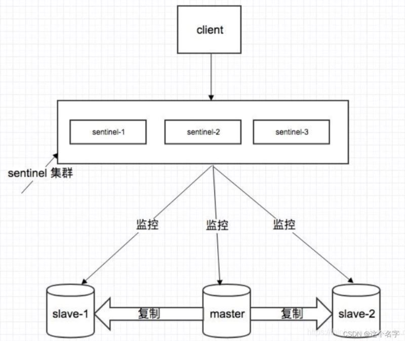 一主两从三哨兵集群,当master节点宕机时,通过哨兵(sentinel)重新推选出新的master节点,保证集群的可用性。
