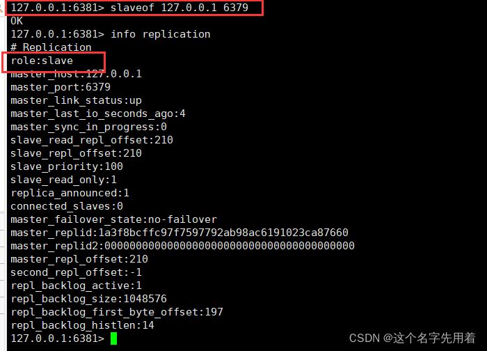 redis-cli -p 6381 #slaveof 主机ip 主机端口号 slaveof 127.0.0.1 6379 info replication