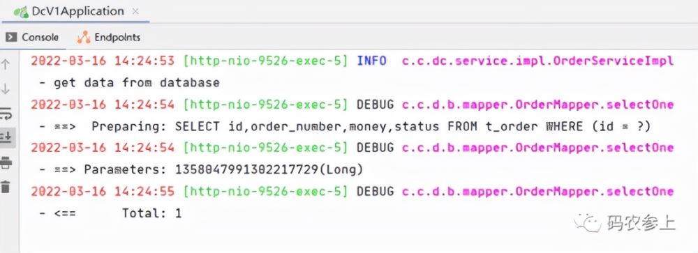 在上面的例子中,设置Caffeine的过期时间为60秒,而Redis的过期时间为120秒,下面进行测试,首先看第一次接口调用时,进行了数据库的查询: