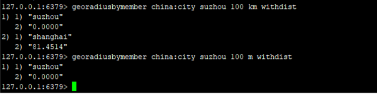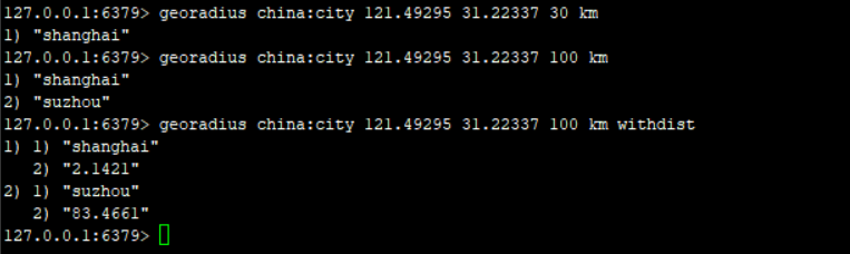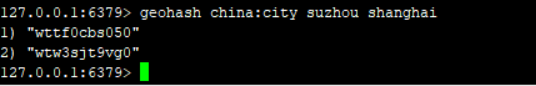 geoadd china:city 121.472644 31.231706 shanghai geoadd china:city 120.619585 31.299379 suzhou geoadd china:city 116.405285 39.904989 beijing geoadd china:city 113.280637 23.125178 guangzhou 113.26197 23.10379 haizhuqu