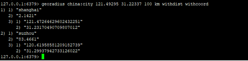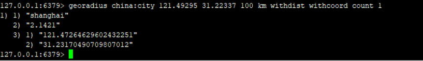 georadius china:city 121.49295 31.22337 100 km withdist withcoord count 1