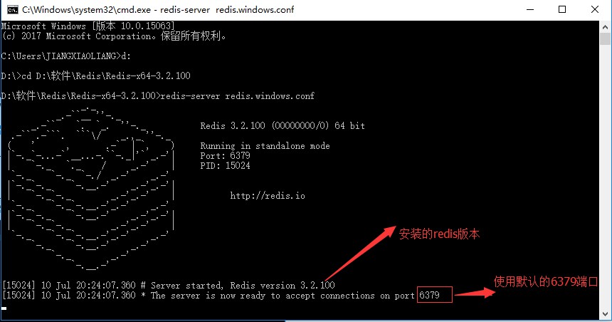 进入redis的解压目录以后,输入:redis-server redis.windows.conf,出现下图所示表示redis服务启动成功: