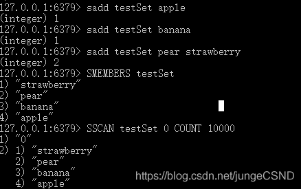 存值:sadd key member [member ...] 取值: SMEMBERS key 或者 SSCAN key cursor [MATCH pattern] [COUNT count]