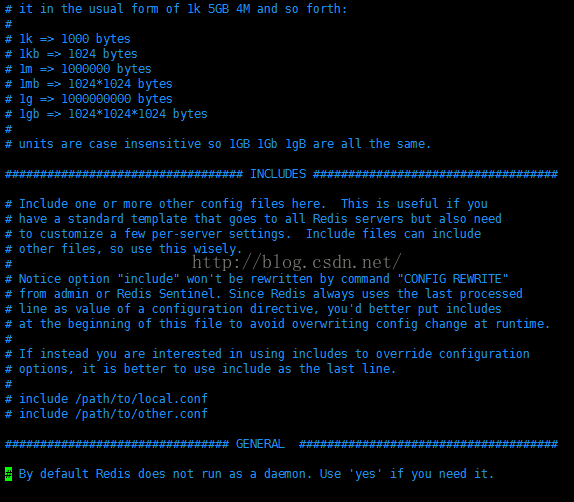 这里的general就是一般的配置了,看到第一个配置项,daemonize,这个意思是一段连续运行的程序,具体我不知道什么原理了,但是只是这个意思就是可以后台启动的配置了。