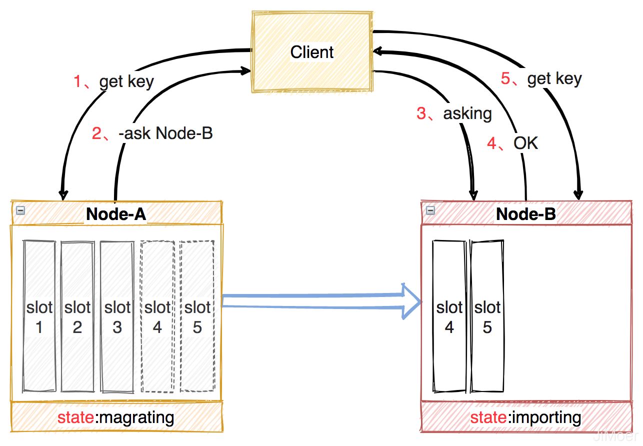 在迁移过程中,客户端首先访问旧节点,如果数据还在旧节点,那么旧节点正常处理,如果不在旧节点,就会返回一个-ASK + 目标节点地址的指令,客户端收到这个-ASK指令后,向目标节点执行一个asking指令(告诉新节点,必须处理客户端这个数据),然后再向目标节点执行客户端的访问数据的指令。