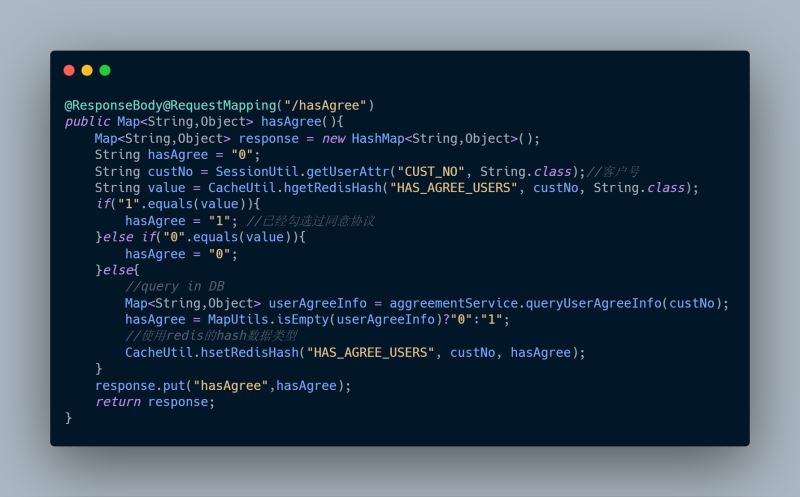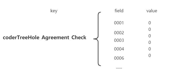 如何预热?将所有用户的信息都放到redis.举个栗子(也许不是最佳的),我们使用Redis的hash数据结构,key-field-value。key我们可以固定一个字符串如coderTreeHole_Agreement_Check,field我们可以用客户号(唯一),value是个标志位,用0代表没同意过协议,1代表同意过。一般在电商大促前都会对热点key进行预热,不然真的扛不住。