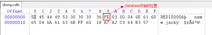 为了方便对照,我在图中标记了一下Database开始的位置,也就是十六进制的 FE。。。