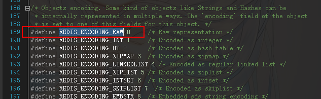 3. database[pairs][type]: 当你知道select哪一号数据库之后,接下来的操作就是怎么去分析key,value数据了,在key/value数据中,第一个就是type,其实这个type就是你的value的encoding类型,可以看到在winHex中表示的0,也就是以下的源码: