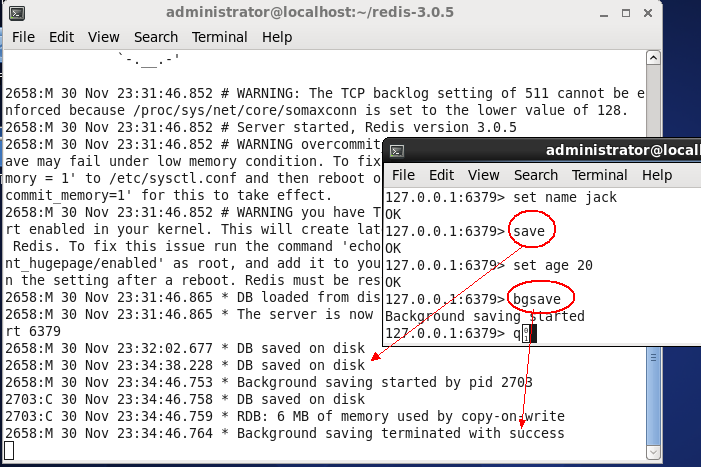 当然可以进行手工操作,redis提供了两个操作命令:save,bgsave,这两个命令都会强制将数据刷新到硬盘中,如下图: