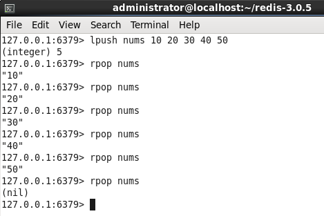 这些方法还是稀里糊涂的有一些的,没关系,做队列使用的话,常用的也就四个:LPOP,LPUSH,RPOP,RPUSH,从这四个单词上面,你应该就明白这有点像数据结构中的“双端队列”,对吧,既然我可以在左边Pop或者Push,又可以在右边Pop或者Push,那这样的话,我又可以把List做成队列或者堆栈,哈哈,是不是很有意思,下面我举个例子:我向List的左边顺序的塞入10,20,30,40,50,然后从队列的另一头依次输出10,20,30,40,50。