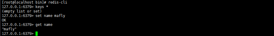 redis-cli #连接 Redis ,默认是本机的。 keys * #查看现在所有 key set name mafly #设置一个key为`name`,value为`mafly`的缓存对象。 get name #获取key为`name`的缓存