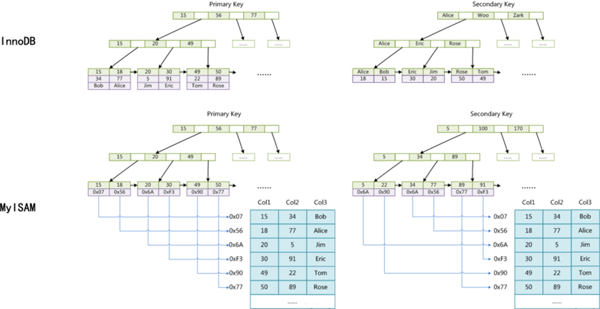 而 MyISAM 方式 B+ 树的叶结点只是存储了数据的地址,故称为非聚集索引。MyISAM 引擎使用 B+Tree 作为索引结构,叶节点的 data 域存放的是数据记录的地址;在 MyISAM 中,主索引和辅助索引(Secondary key)在结构上没有任何区别,只是主索引要求 key 是唯一的,而辅助索引的 key 可以重复。