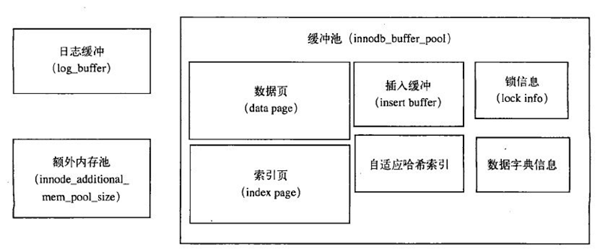 InnoDB 的内存主要有以下几个部分组成:缓冲池 (buffer pool)、重做日志缓冲池(redo log buffer)以及额外的内存池(additional memory pool),如下图所示:
